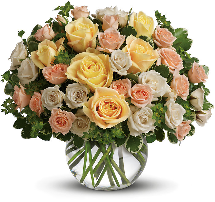 It will be a magic moment when this divine bowl of pastel roses is hand-delivered to someone special. Perfect for any occasion, the soft colors and variety of rose blossoms will soothe anyone's soul. Beautiful yellow roses, peach and white spray roses and greens are delivered in a clear glass bubble ball. The effect is magical.