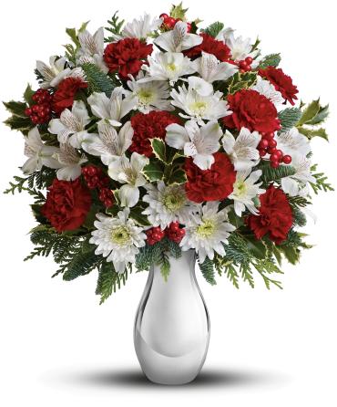 Pure winter wonder! Crimson carnations and red berries bring a festive touch to the snowy blooms of this lush holiday bouquet. Our magnificent silver vase makes this a gift to remember!