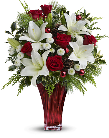 Send them the wonders of winter with beautiful red roses, snow white lilies and fresh winter greens arranged in an elegant and unique glass vase.